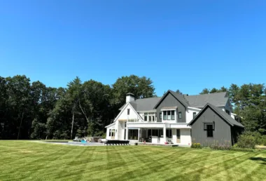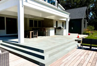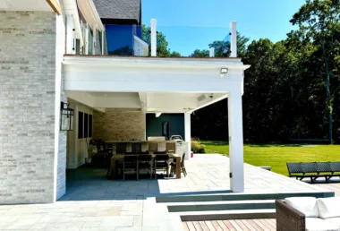 This complete hardscape transformation in Wenham MA, brought new life to a backyard with a seamless blend of structure and style. At its heart is a spacious raised bluestone patio, elevated by expertly crafted Pennsylvania fieldstone walls topped with matching bluestone caps. A striking white brick outdoor kitchen was built into the design, with full utility excavation and prep completed to ensure function meets form. Lush sod, curated plantings, and crisp black mulch finish the space, creating a polished, inviting outdoor retreat that balances natural beauty with high-end craftsmanship.