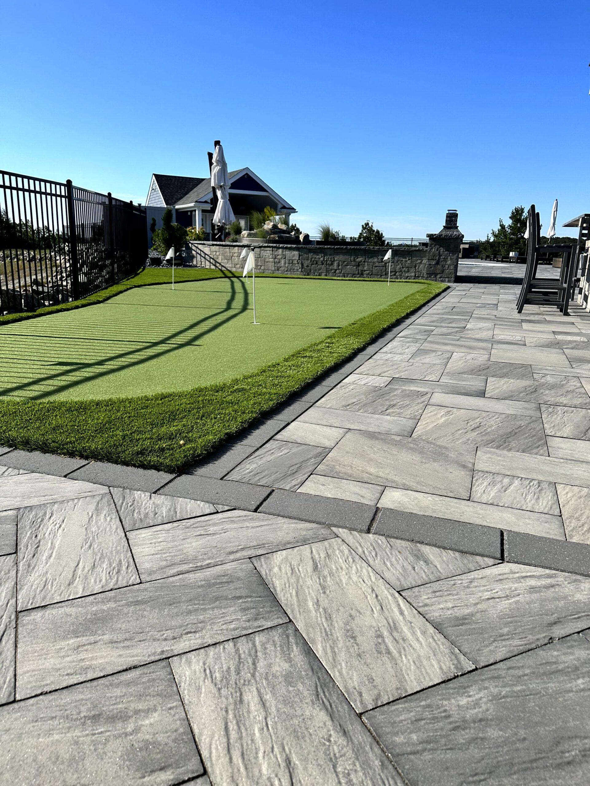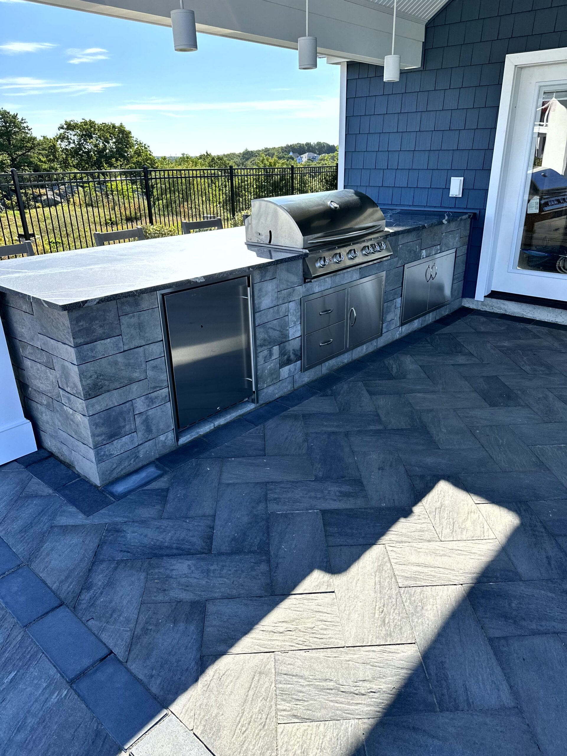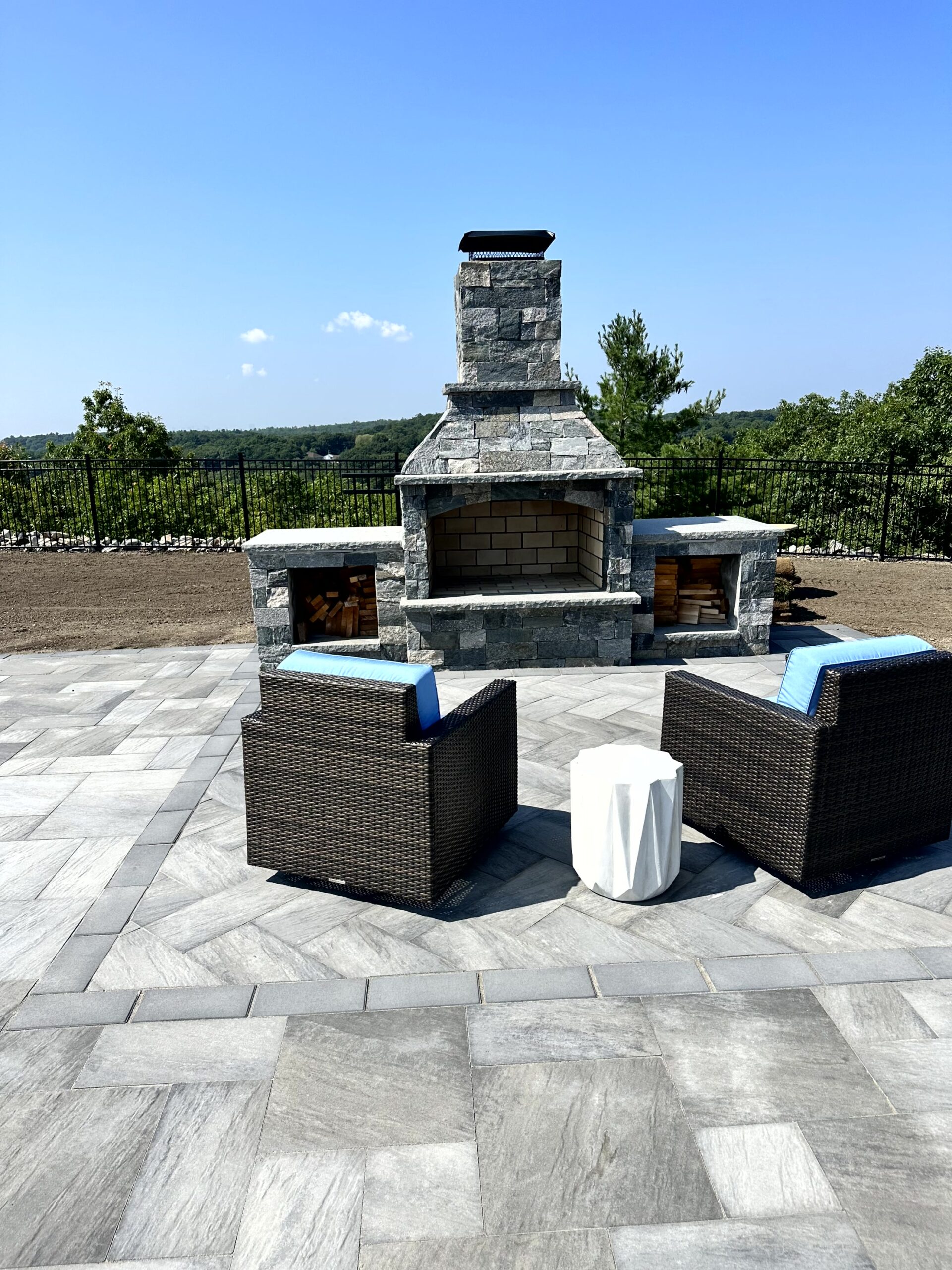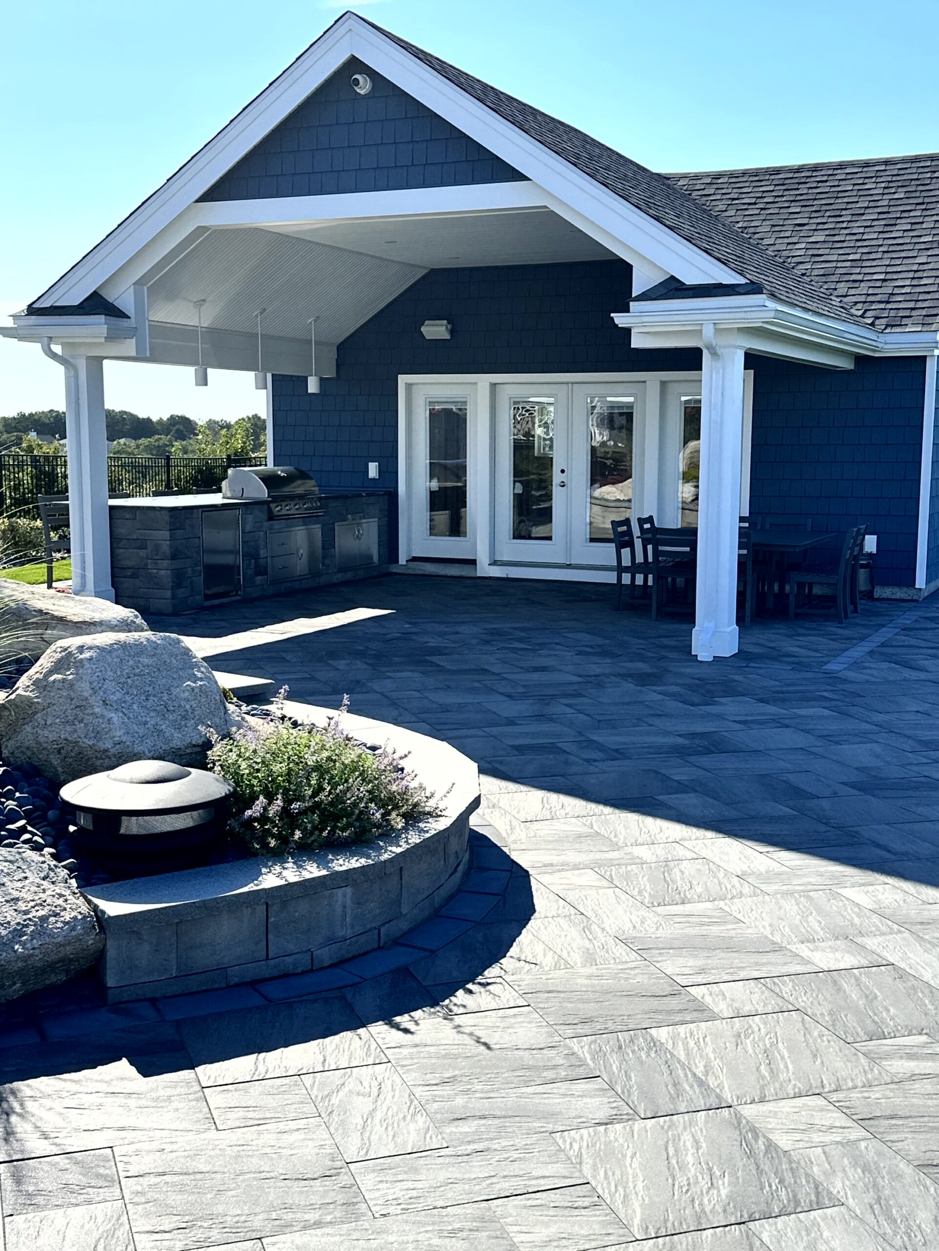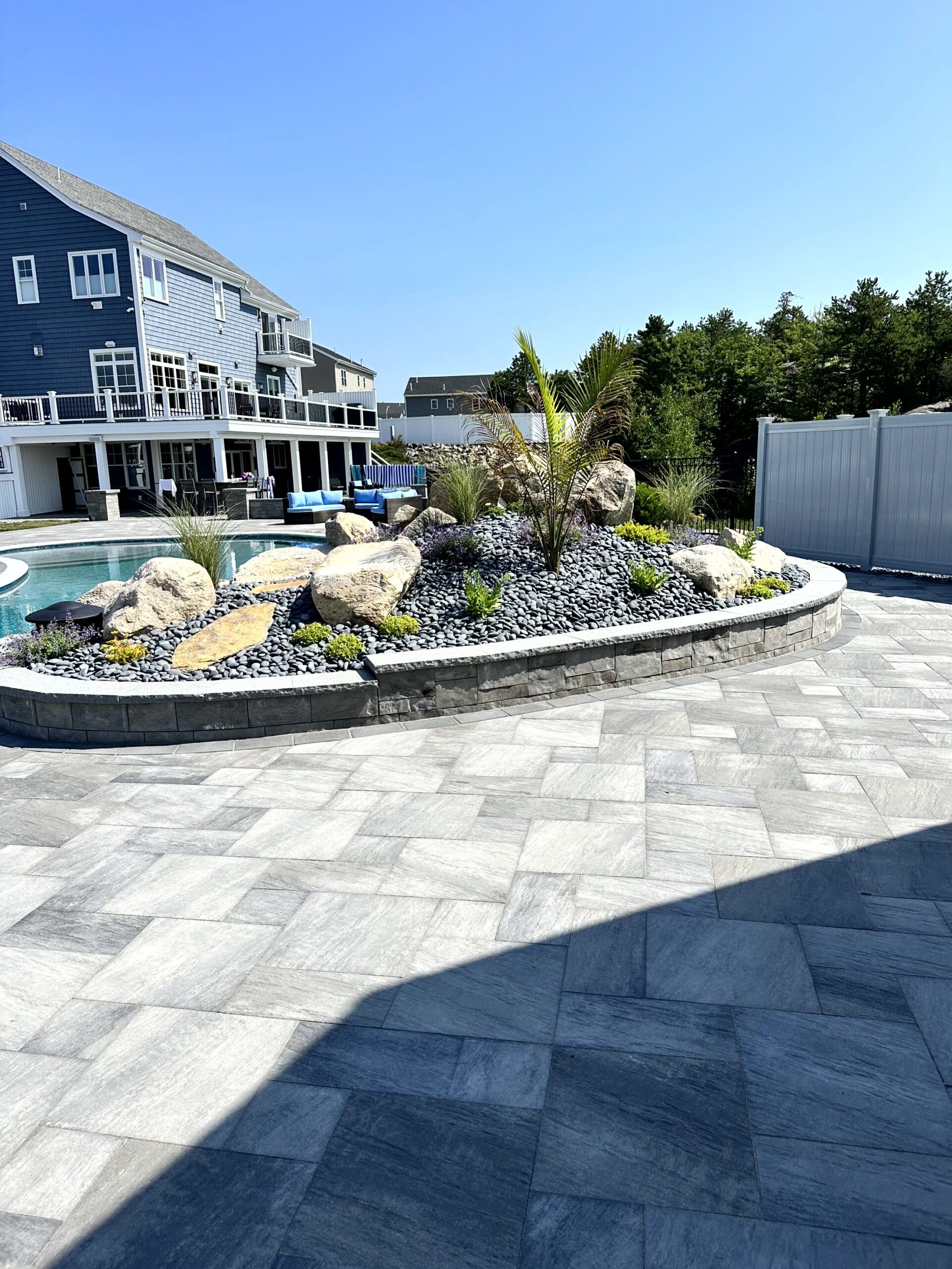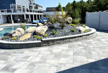 The Outdoor Oasis in Peabody, MA, is more than just a backyard retreat; it’s a sanctuary for the busy business owner and their family. Months of meticulous planning and client meetings culminated in the flawless execution of this project. Starting with the construction of a sturdy retaining wall and leveling of the pool area, followed by precise utility placement and finish grading, every detail was carefully considered. The cabana’s foundation was expertly laid out, creating a focal point for the outdoor space. But the true highlights are the custom-built outdoor kitchen, inviting fireplace, cozy firepit, and elegant sitting walls. The landscape was meticulously adorned with lush plantings, each receiving the perfect amount of water through drip irrigation, while the sod was expertly laid with a reliable irrigation system in place. This Outdoor Oasis is not just a space; it’s a work of art that enhances every moment spent in its embrace.