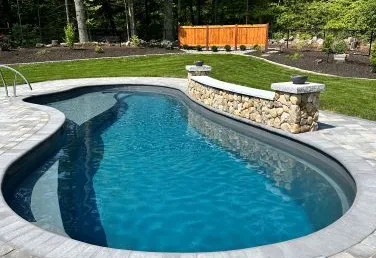 Surrounding the pool is a sprawling patio space designed with plenty of room for relaxing in the sun by the pool. This patio boasts a stone fire pit to gather around on chilly New Hampshire nights. This patio also boast an area to relax in a hammock by the pool, as well as plenty of space for lounge chairs. On the other side to finish the patio off we collaborated to bring in a stunning pergola from Eastern Shed. The homeowners can now swim and then escape the sun and relax in style. Our design team has worked seamlessly with Eastern Shed on multiple occasions to create luxurious outdoor spaces perfect for dining and unwinding. This pergola features an overhead fan, as well as a TV so this family can watch movies or sporting events with friends and family.
