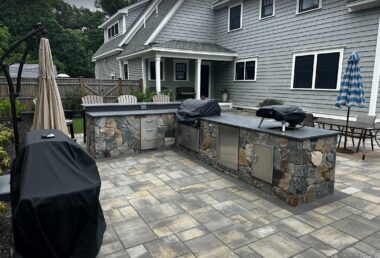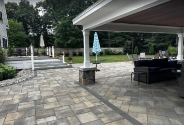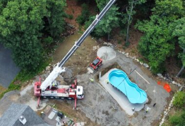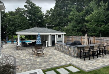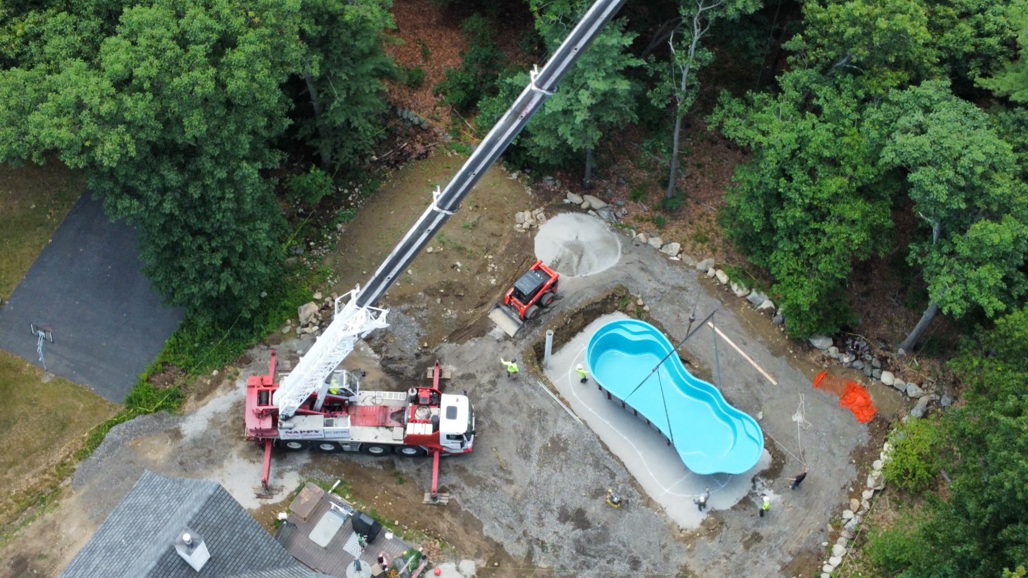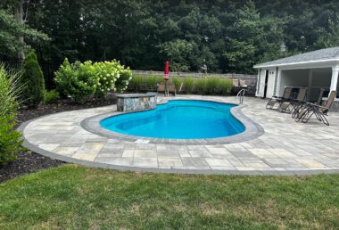 This project in North Reading MA, presented a unique set of challenges, beginning with the significant grade correction required to accommodate the fiberglass pool installation. The original yard sloped unevenly, necessitating extensive excavation, backfill, and compaction to create a stable, level base. Precision was critical—fiberglass pools demand exact leveling tolerances, and any ground movement could compromise the shell integrity over time.