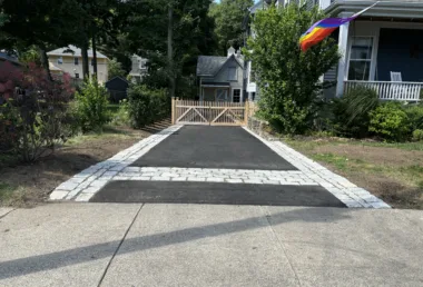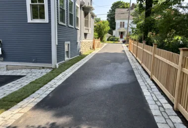 In the picturesque town of Melrose, MA—where classic New England charm meets refined living—this driveway stands out with jumbo reclaimed granite cobblestones framing a smooth asphalt surface. The natural stone brings texture and timeless appeal, creating a warm, inviting entrance that complements the character of its surroundings.
